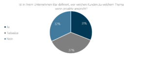 Erkenntnis 4: Ein knappes Drittel der Teilnehmenden gibt an, dass überhaupt klar definiert ist, wer welchen Kunden zu welchem Thema anzusprechen hat. Bei den verbleibenden Unternehmen sind die Aufgaben und Verantwortlichkeiten nur teilweise oder gar nicht definiert.