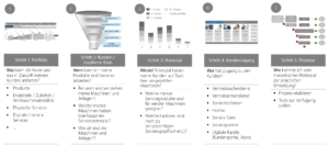 Wendet sich ein Kunde mit einem Anliegen oder Bedarfsfall an das Unternehmen, reagiert die Organisation und handelt somit reaktiv. Ein solcher Kontakt kann beispielsweise über eine Service-Hotline entstehen, aber ebenso über die Kunden-initiierte Inanspruchnahme von Leistungen, wie die Anfrage von benötigten Ersatzteilen oder die Durchführung einer Wartung. Die Organisation geht nicht aktiv auf den Kunden zu, sondern nimmt die Rolle einer ‘Auftragsannahmestelle’ ein und nicht die eines Vertriebs. Den tatsächlichen Vertrieb kann man in ‘aktiv’ und ‘proaktiv’ unterteilen: Aktiv bedeutet vor, nach oder während einer Anfrage bzw. bei kurzfristig identifizierten Bedarfsfällen zu handeln. Proaktivität hingegen zeichnet sich durch die frühzeitige Planung und Durchführung von Maßnahmen aus, um künftigen Problemen vorzubeugen bzw. mögliche Bedarfsfälle frühzeitig zu identifizieren. Predictive Maintenance ist ein Beispiel für die frühzeitige Erkennung möglicher Problemfälle. Ist ein solcher erkennbar, sollte der Kunde proaktiv angesprochen und eine Lösung angeboten werden. Um im Service zu einem proaktiven Vertriebsansatz zu kommen ist aus unserer Erfahrung die gezielte Beantwortung der folgenden fünf Fragen bzw. Bearbeitung der genannten Schritte notwendig: