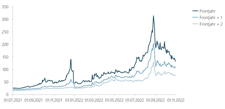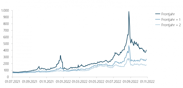 Die Entwicklung der Preisdifferenzen zwischen den einzelnen Frontjahren veranschaulicht ein stark abfallendes Preisniveau für weiter in der Zukunft liegende Lieferjahre. Es zeigt sich insbesondere, dass die absolute Volatilität der Preise bei den weiter in der Zukunft liegenden Lieferjahren deutlich geringer als im Frontjahr ist und dass zwar alle Preise dem Trend des hohen Preisniveaus folgen, die Preisentwicklung aber weiter in der Zukunft gedämpft ist. Vor dem Hintergrund der unsicheren Versorgungssituation – mindestens im Winter 2023/2024 – ist dies eine interessante Beobachtung zur derzeit im Markt gehandelten Risikoprämie.