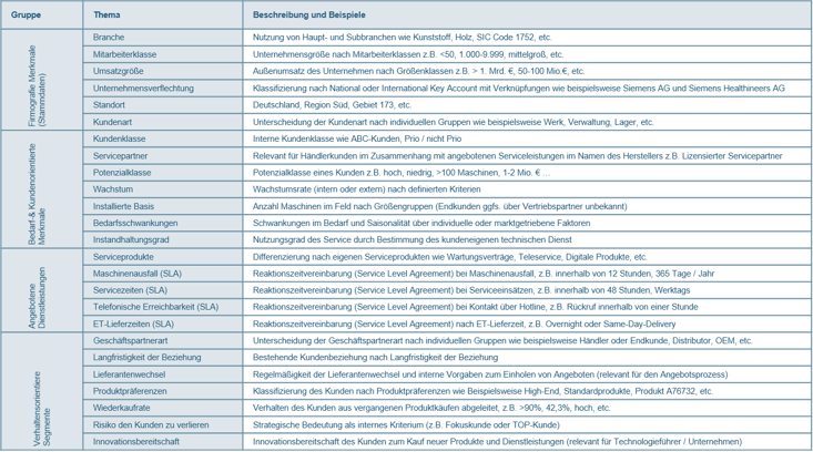 1. Firmografische Segmente: Unternehmen segmentieren ihren After-Sales-Service hauptsächlich mit Hilfe von internen, historisch gewachsenen Daten sowie einfach zugänglichen externen Informationen – allen voran firmografischen Merkmalen. Die Aktualität der Daten wird hier oftmals vernachlässigt (z.B. Mitarbeiterzahl, Unternehmensverflechtungen) und sollten gelegentlich über Datenbankabgleiche aktualisiert werden.