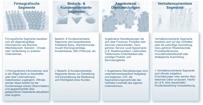 Zur Clusterung einer Vielzahl von Merkmalen werden firmografische-, bedarfs- & kundenorientierte- sowie angebotene Dienstleistungen und verhaltensorientierte Segmente unterschieden.
