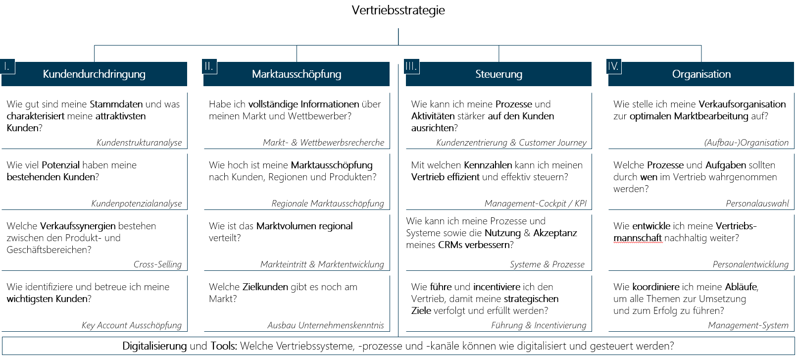 Im Rahmen der Entwicklung einer Vertribsstrategie gilt es insbesondere viele Fragen zu beantworten, um daraus Ziele und die eigene Ausrichtung abzuleiten.