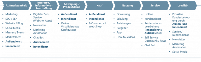 Der Vertrieb wird von nicht bekannten, potenziellen Neukunden in der Aufmerksamkeitsphase häufig gar nicht sowie im Rahmen der Informationsbeschaffung erst als letzte Quelle mit eingebunden. Dies gilt insbesondere dann, wenn der Erklärungsbedarf der Produkte gering ist. D.h. die Aufgabe des Außendienstes liegt in diesem Fall darin, den Interessent von den Produkten in der Abwägungsphase final zu überzeugen und den weiteren Kaufprozess zusammen mit dem Innendienst zu begleiten. War der Abschluss erfolgreich und der Interessent wird zum Kunden, kann durch eine proaktive Kundenbetreuung die Loyalität gefördert werden. Die Customer Journey beginnt von vorne. Der Vertrieb hat es aber jetzt in der Hand den Kunden zu binden und durch geeignete Maßnahmen die Aufmerksamkeit für weitere Produkte und Services zu wecken.