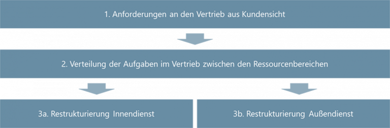 Die Restrukturierung des Vertriebs betrifft häufig sowohl den Innen- als auch den Außendienst, da sich das Aufgabenspektrum zwischen den Bereichen verschiebt. Im Folgenden soll zunächst auf die Vorgehensweise zur Restrukturierung im Innendienst eingegangen werden, während der Außendienst im nächsten Abschnitt separat beleuchtet wird.
