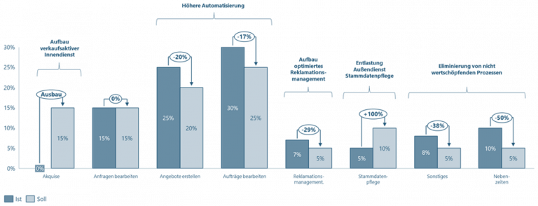 Durch den Soll-Ist-Vergleich lassen sich Optimierungs- und Einsparpotenziale bestimmen. Wichtig ist dabei immer den Potenzialen die notwendigen Maßnahmen und Prämissen gegenüberzustellen, um diese realisieren zu können. Eine Einsparung kann immer nur dann erreicht werden, wenn die dazugehörigen Maßnahmen erfolgreich umgesetzt wurden und die vermuteten Prämissen eingetreten sind. Ein digitaler Verkaufskanal entlastet den Innendienst nur dann, wenn darüber tatsächlich Bestellungen erfolgen, welche der Innendienst im Nachgang nicht mehr zu bearbeiten hat.