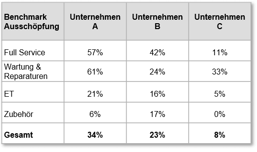 - Zur Berechnung der jeweiligen Ausschöpfung werden die einzelnen Servicepotenziale dem mit den betreuten Maschinen erzielten Umsatz gegenübergestellt. Die nebenstehenden Benchmarks können dabei einen ersten Indikator zur besseren Einschätzung der eigenen Unternehmenssituation vermitteln.